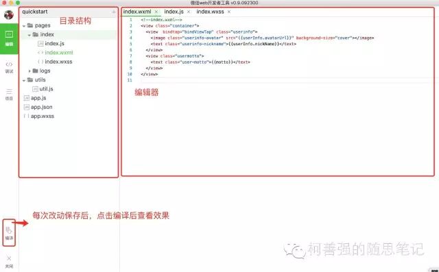 左边红色框为项目结构目录,右边为代码编辑区,每次改动保存后,点击『编译』就可以浏览到修改后的页面效果。
