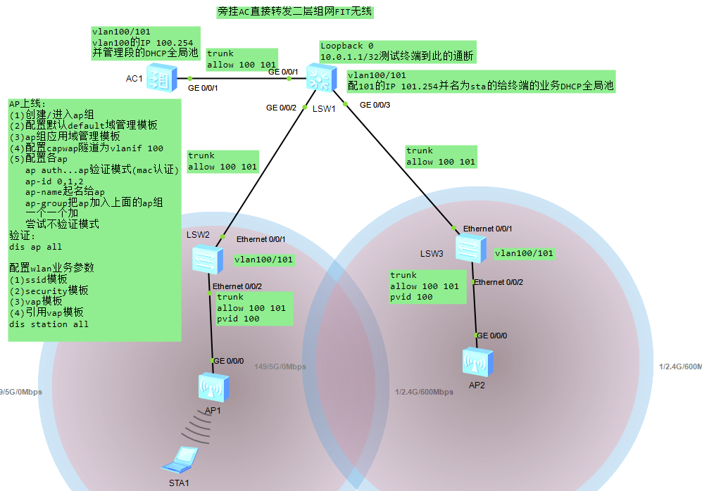 华为AC+FIT AP 典型组网部署配置-旁挂AC直接转发二层组网