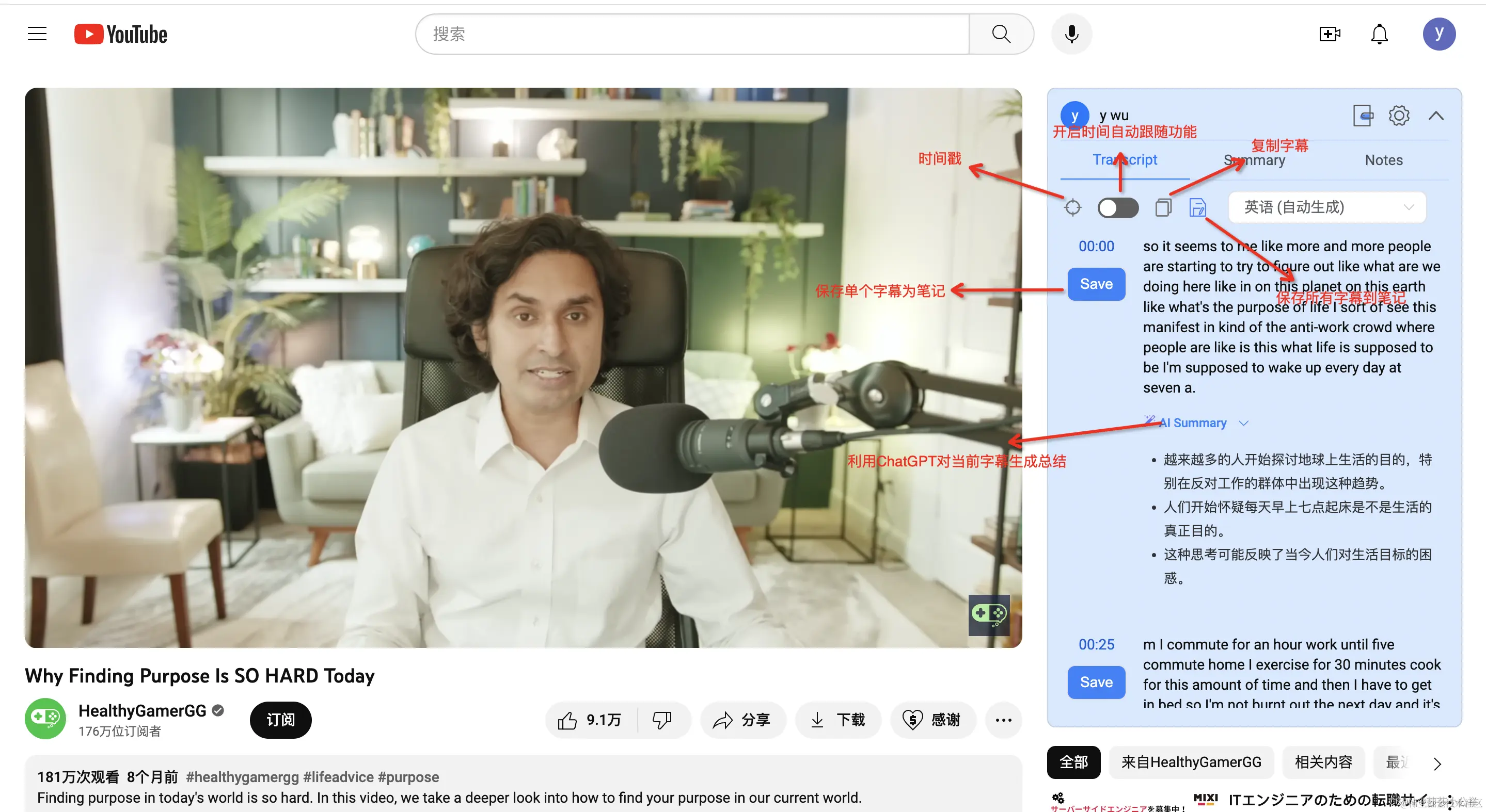 这里我在使用的时候比较喜欢ChatGPT对单个字幕进行总结以及开启时间自动跟随两个功能