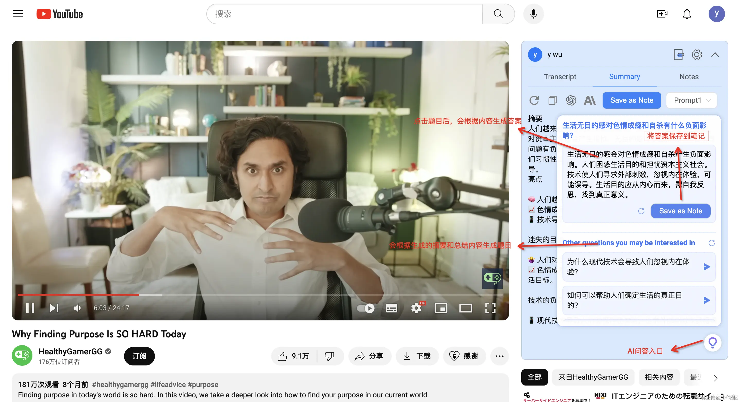 这一块功能目前是我使用的核心,利用了ChatGPT生成摘要和总结,可以快速帮助我们了解视频的大概内容,节约时间成本,并提供了AI问答的能力