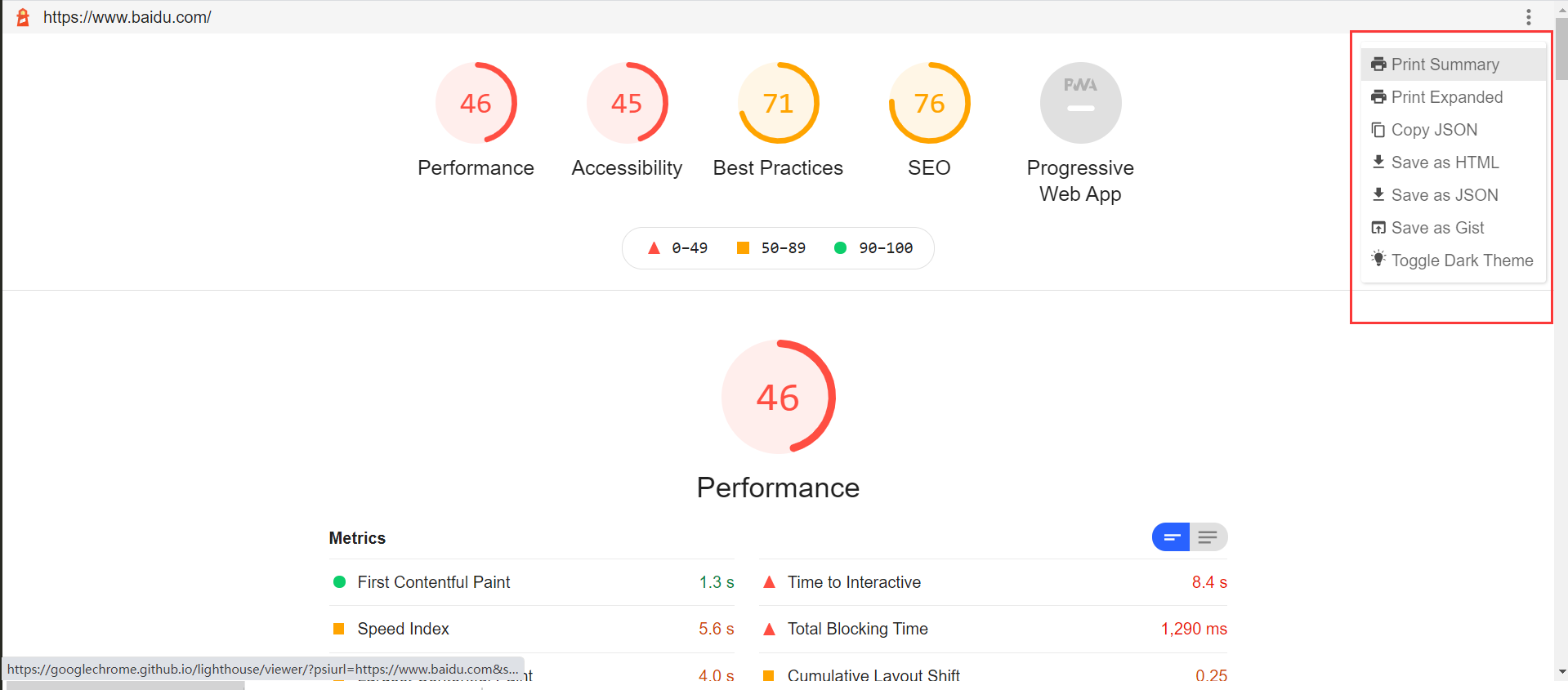 使用:打开需要测试的地址,通过扩展程序选择并点击生成报告,则会进入分析页面,或者使用url直接打开,地址中psiurl后拼接的即是要分析的页面地址:https://googlechrome.github.io/lighthouse/viewer/?psiurl=https://www.baidu.com&strategy=mobile&category=performance&category=accessibility&category=best-practices&category=seo&category=pwa&utm_source=lh-chrome-ext
