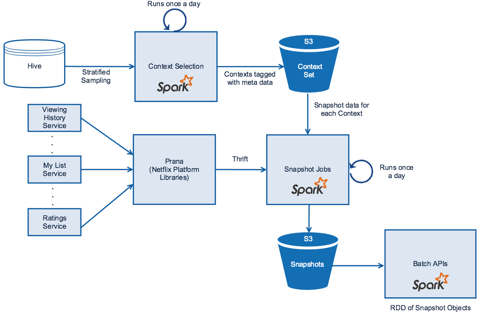 Snapshot Jobs 这个核心模块每天的任务就是,通过 Context Set 获取场景信息,通过 Prana 获取日志信息,再经过整合处理、生成特征之后,保存当天的数据快照到 S3。