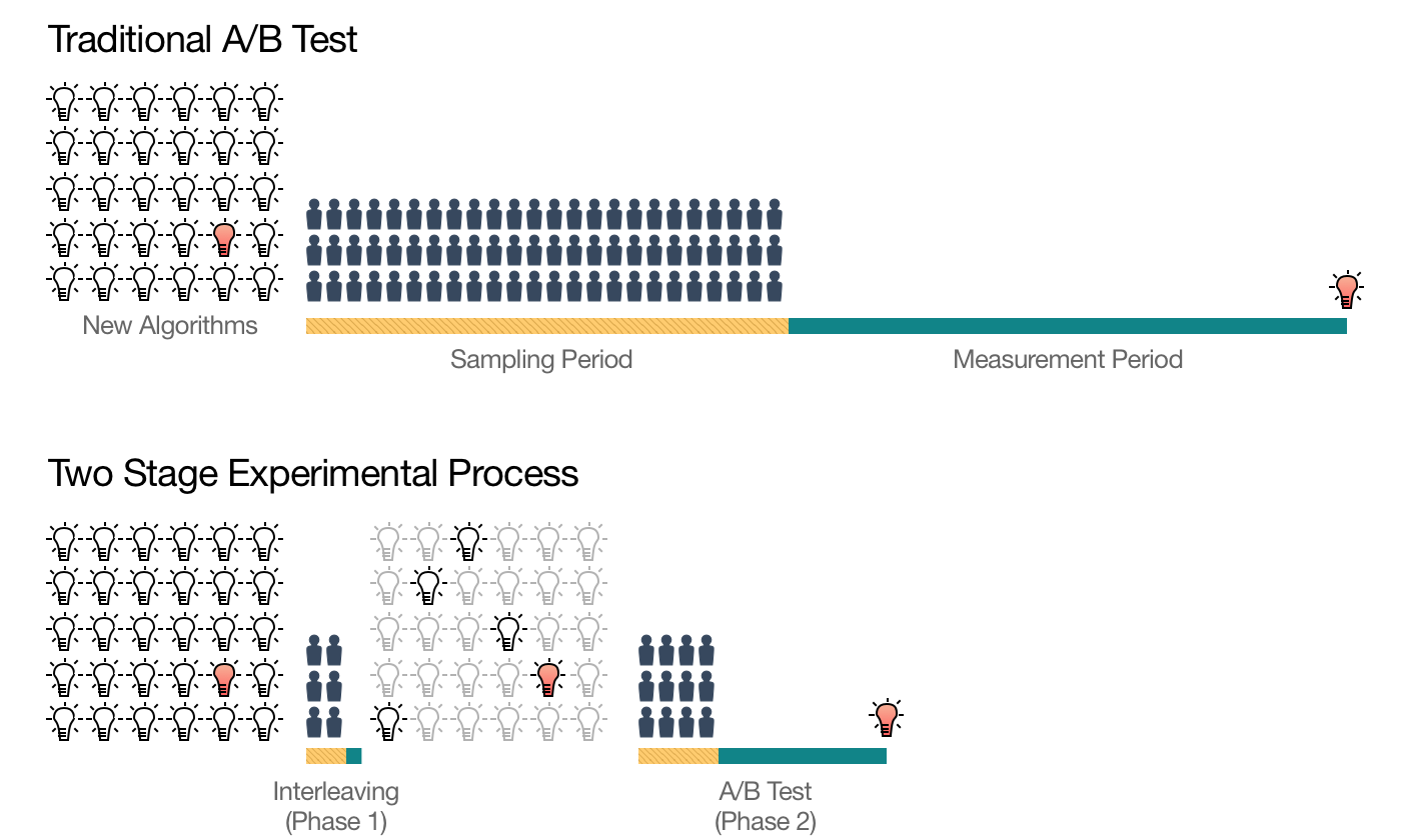 ① Interleaving方法的灵敏度高于A/B测试。Netflix的实验表明,Interleaving方法利用\(10^3\)个样本就能判定算法A是否好于算法B,但是A/B测试则需要\(10^5\)个样本。