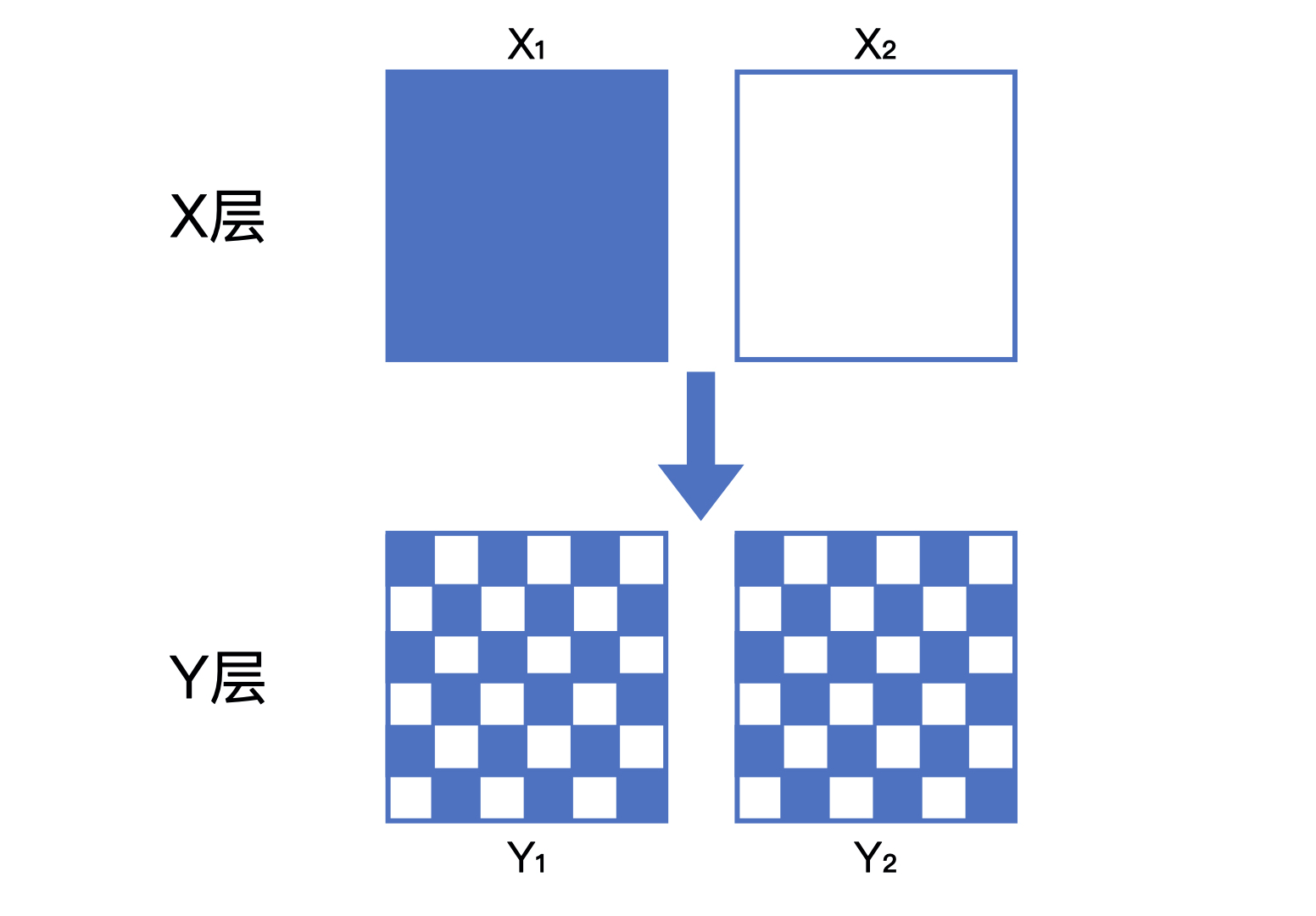 假设,在一个 X 层的实验中,流量被随机平均分为 X1(蓝色)和 X2(白色)两部分。当它们穿越到 Y 层的实验之后,X1 和 X2 的流量会被随机且均匀地分配给 Y 层的两个桶 Y1 和 Y2。
