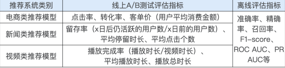② 线上系统的某些商业指标在离线评估中无法计算。 离线评估一般是针对模型本身进行评估的,无法直接获得与模型相关的其他指标,特别是商业指标。像我们上节课讲的,离线评估关注的往往是ROC曲线、PR曲线的改进,而线上评估却可以全面了解推荐模型带来的用户点击率、留存时长、PV访问量这些指标的变化。