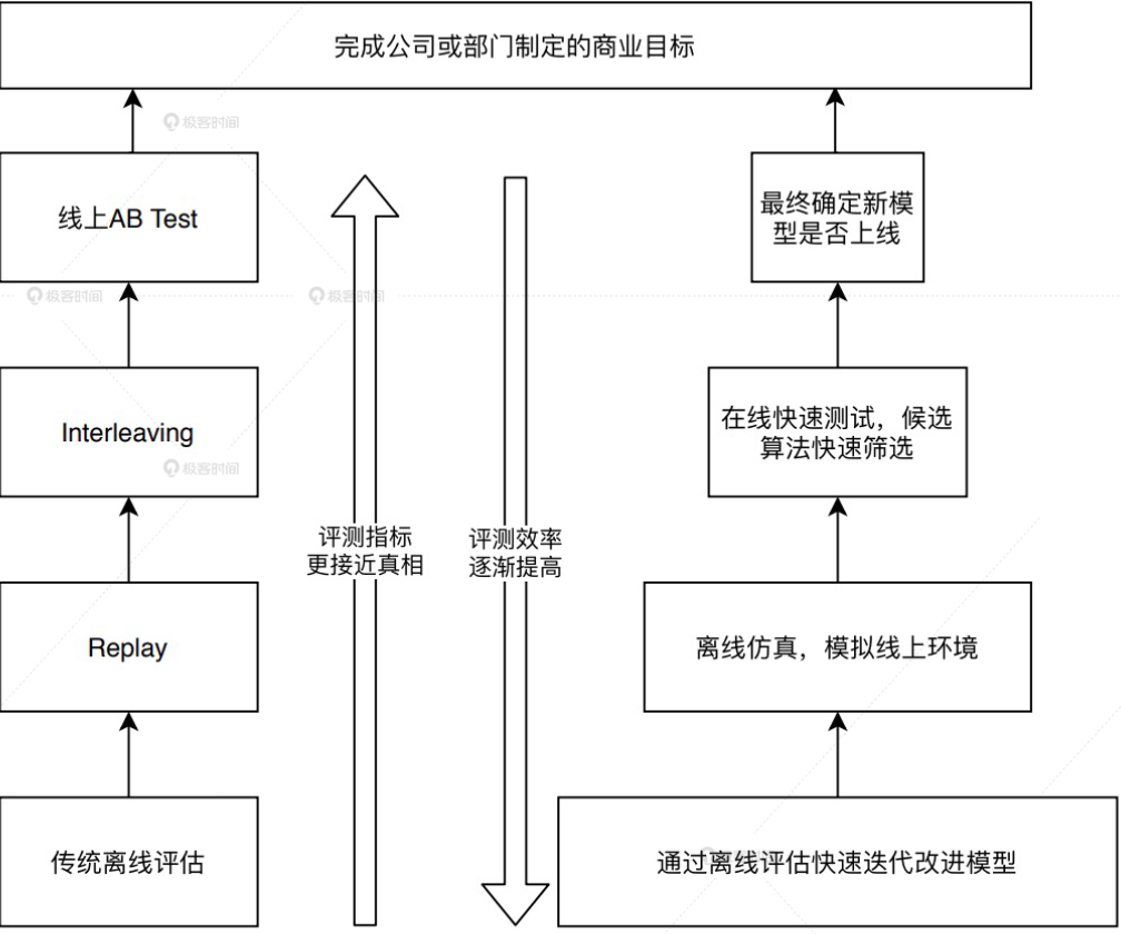 处于最底层的是传统的离线评估方法,比如 Holdout 检验、交叉检验等,往上是离线 Replay 评估方法,再往上是一种叫 Interleaving 的线上测试方法,最后是线上 A/B 测试。