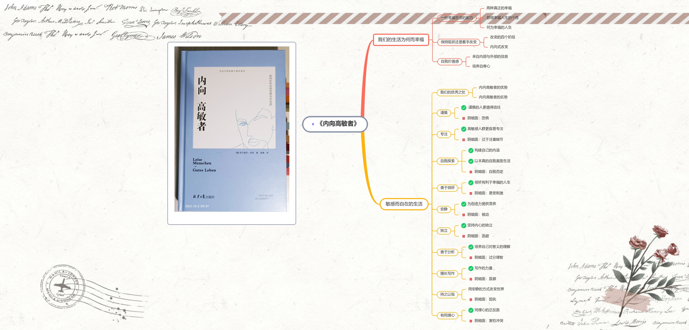 然而当我开始从整体上整理这份读书笔记时我才发现书籍的第一章是在探究何为幸福的生活,我似乎并不明白内向高敏者的样貌与定义。书籍第二章第一节给出了一些优势和劣势,但我并不喜欢对标签入座,于是我去维基百科上找了一段描述来确定自己是否真的属于内向高敏者: