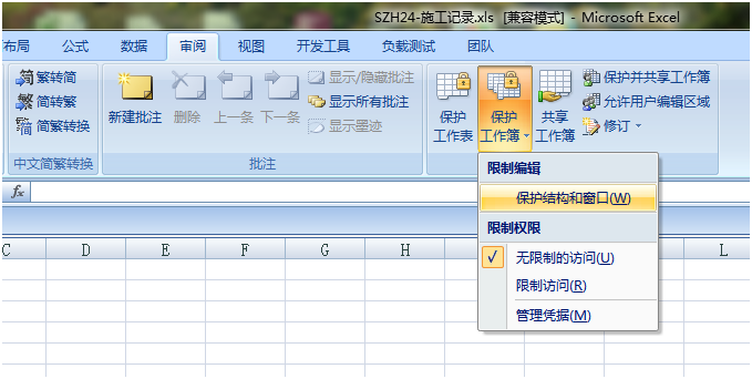这样,就对工作簿的结构设置了保护,用户如果不知道密码则无法复制、删除或插入工作表,也不能修改工作表名称。如果在上述对话框中选择了"窗口",会禁止用户更改工作表窗口大小和位置。