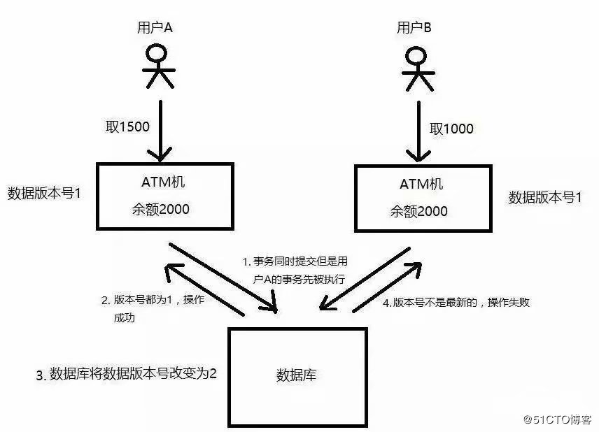 如图,假设同一个账户,用户A和用户B都要去进行取款操作,账户的原始余额是2000,用户A要去取1500,用户B要去取1000,如果没有锁机制的话,在并发的情况下,可能会出现余额同时被扣1500和1000,导致最终余额的不正确甚至是负数。但如果这里用到乐观锁机制,当两个用户去数据库中读取余额的时候,除了读取到2000余额以外,还读取了当前的版本号version=1,等用户A或用户B去修改数据库余额的时候,无论谁先操作,都会将版本号加1,即version=2,那么另外一个用户去更新的时候就发现版本号不对,已经变成2了,不是当初读出来时候的1,那么本次更新失败,就得重新去读取最新的数据库余额。