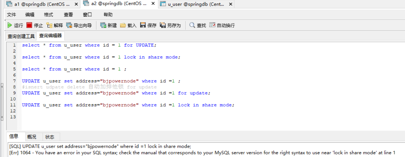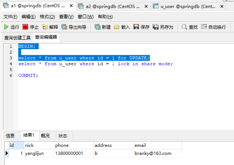 UPDATEu_user set address="bjpowernode " where id =1 for update;