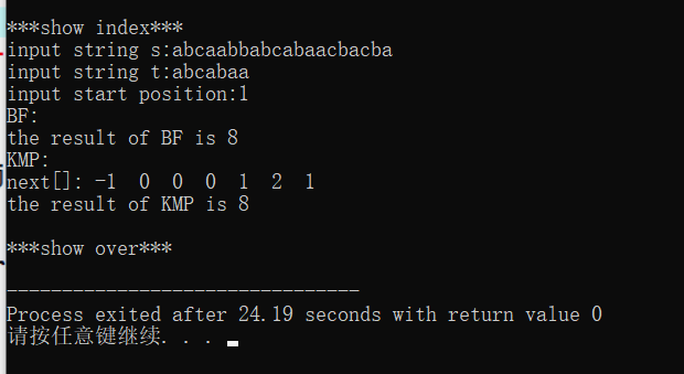 printf("the result of KMP is %d\n",index_kmp(&s,&t,k,next));