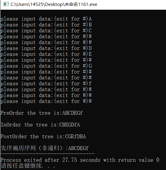 printf("\n\n先序遍历序列(非递归):");