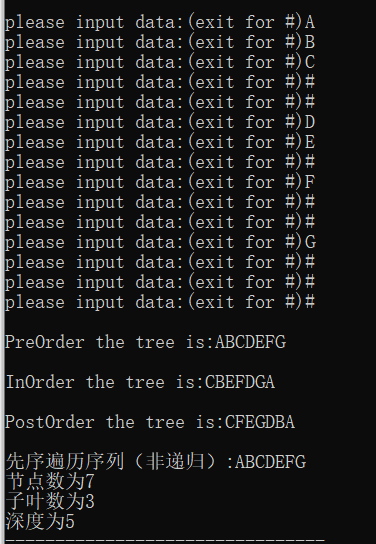 4、在上题中补充求二叉树深度算法,并在主函数中补充相应的调用验证正确性。