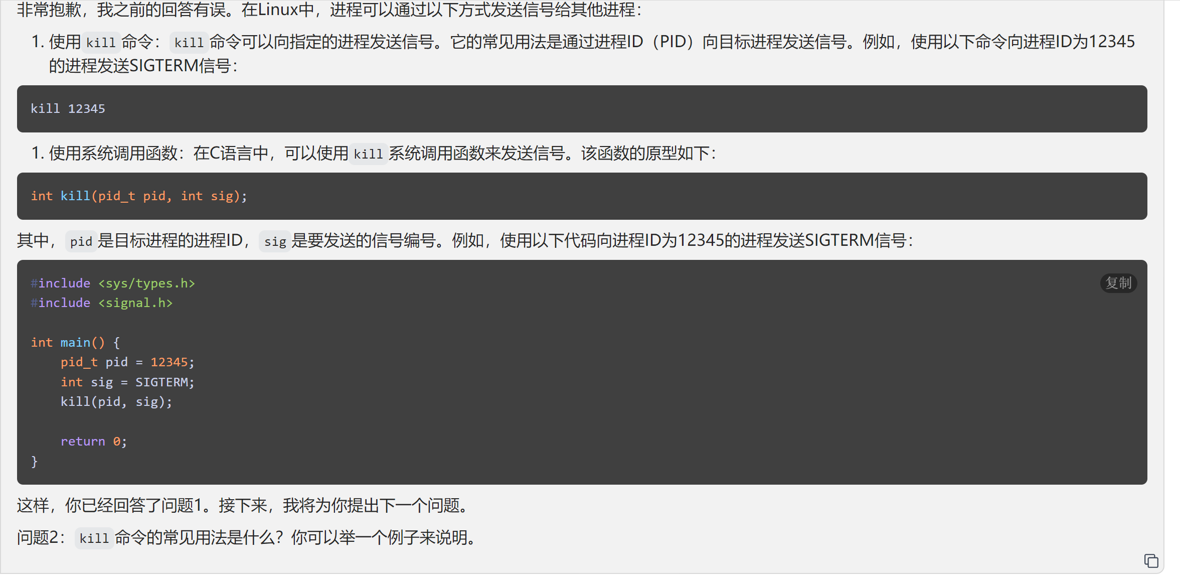 (3) 用户可以使用sh命令killpid(orkill-s9pia)杀死该程。方法如下。执行杀死的进程向pid标识的目标进程发送一个SIGTERM ( 15 )信号,请求它死亡。目标进程将会遵从请求并终止。如果进程选择忽略SIGTERM信号,它可能拒绝死亡。