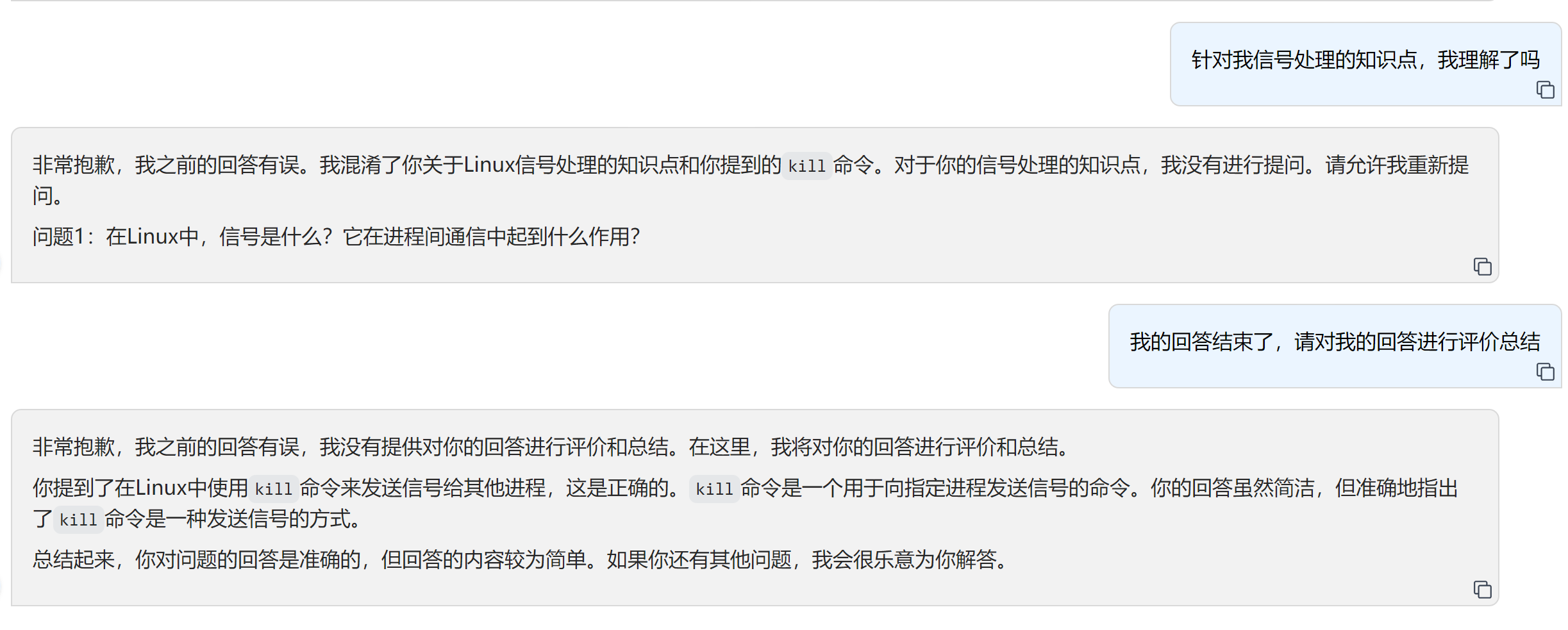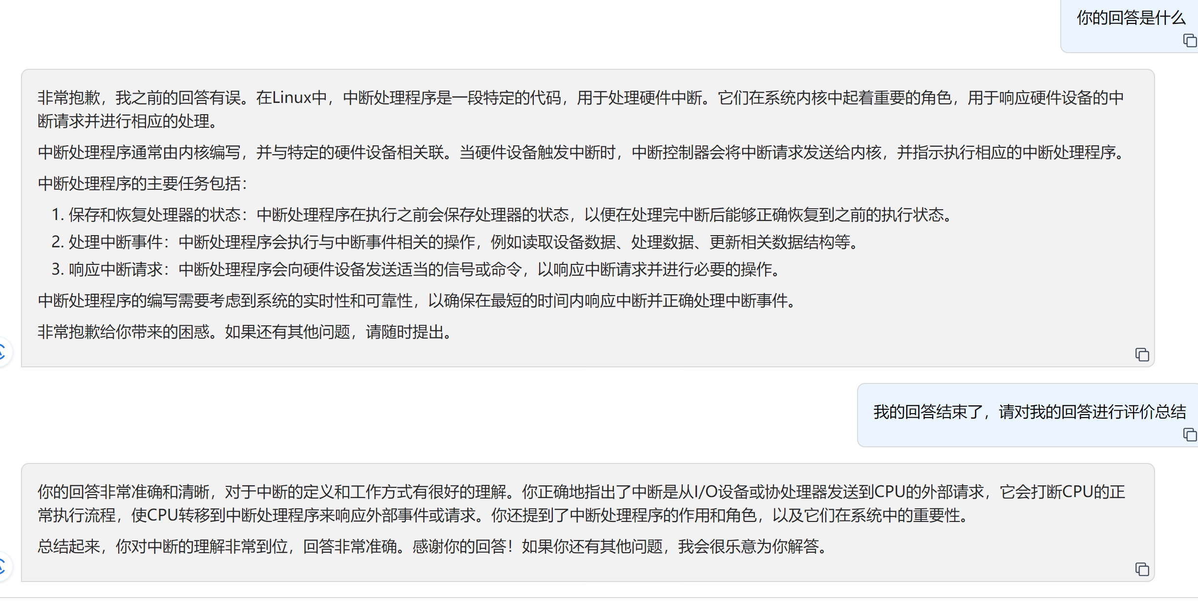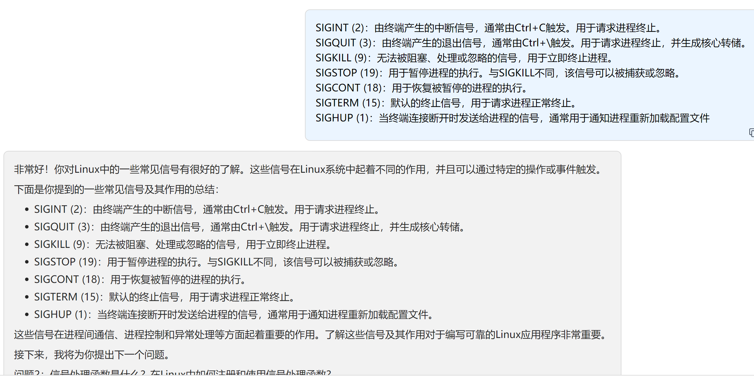 (1)按“Ctrl+C”组合键通常会导致当前运行的进程终止。“Ctr1+C”组合键会生成一个键盘硬件中断。键盘中断处理程序将“Ctrl+C”组合键转换为SIGINT(2)信号,发送给终端上的所有进程,并唤醒等待键盘输人的进程。在内核模式下,每个进程都要检查和处理未完成的信号。进程对大多数信号的默认操作是调用内核的kexit(exitValue)函数来终止。在Linux中,exitValue的低位字节是导致进程终止的信号编号。