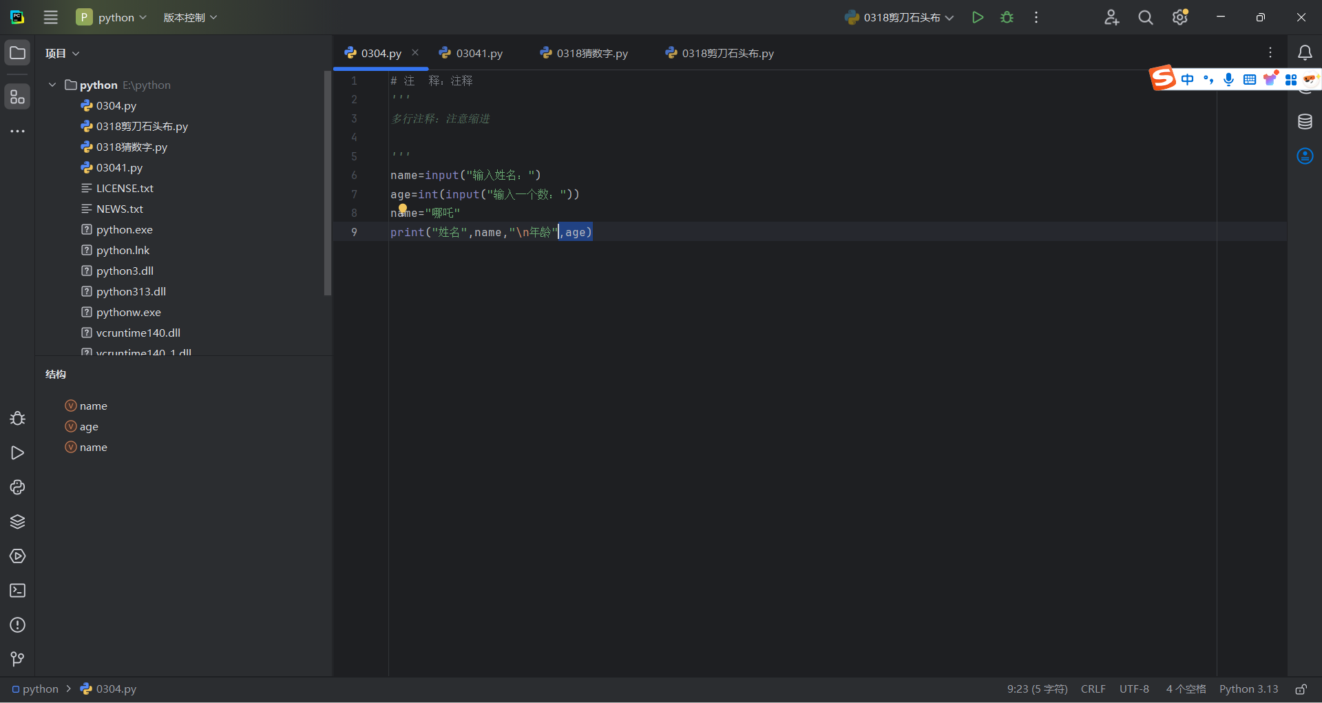 3.编写程序,练习变量和类型、字符串、对象、缩进和注释等;