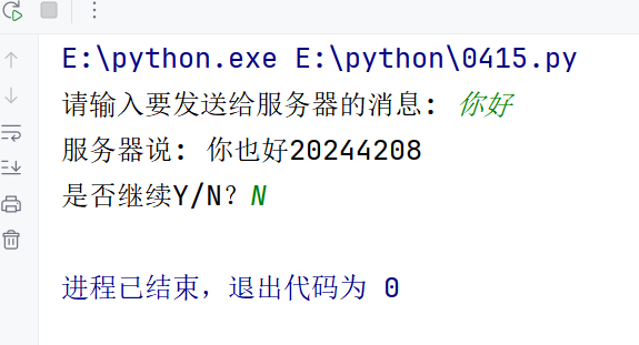 进入循环,开始对话部分;由客户端实现对话控制,一轮对话结束后,输入Y继续对话,输入N结束对话