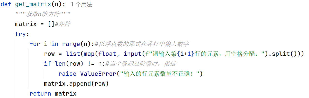 1.定义函数get_matrix(n):识别输入的方阵(主程序中,将n定义为矩阵阶数)