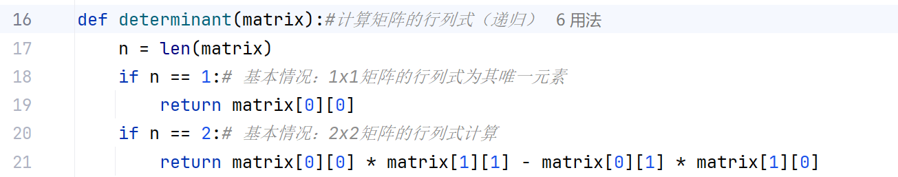 if n == 1:# 基本情况:1x1矩阵的行列式为其唯一元素
