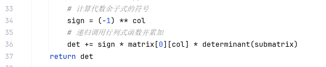 2.定义函数determinant(matrix):通过递归计算矩阵对应的行列式的值