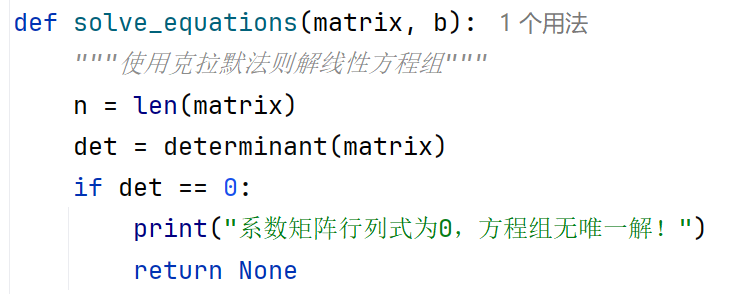 4.定义函数solve_equation(matrix,b):使用克拉默法则,求解线性方程组