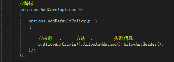 //跨域 services.AddCors(options => { options.AddDefaultPolicy(c => { //AllowAnyOrigin 来源 AllowAnyMethod 方法 AllowAnyHeader头部信息 c.AllowAnyOrigin().AllowAnyMethod().AllowAnyHeader(); }); }); -