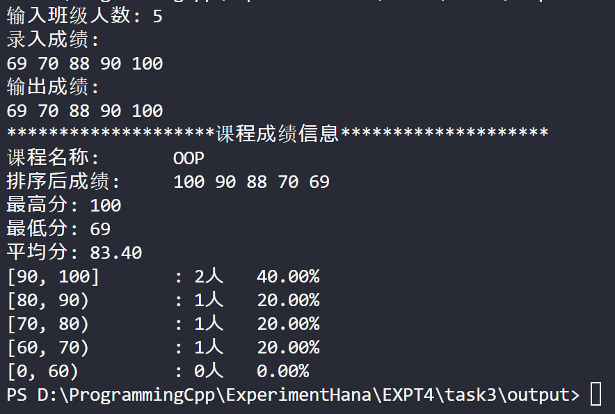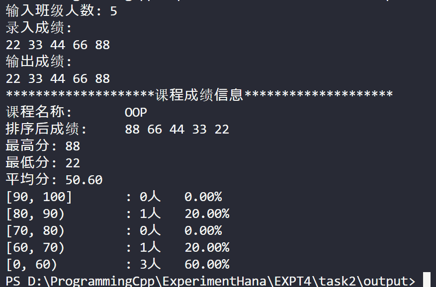 1 #include "GradeCalc.hpp" 2 #include <iomanip> 3 4 void test() { 5 int n; 6 cout << "输入班级人数: "; 7 cin >> n; 8 9 GradeCalc c1("OOP", n); 10 11 cout << "录入成绩: " << endl;; 12 c1.input(); 13 cout << "输出成绩: " << endl; 14 c1.output(); 15 16 cout << string(20, '*') + "课程成绩信息" + string(20, '*') << endl; 17 c1.info(); 18 } 19 20 int main() { 21 test(); 22 }