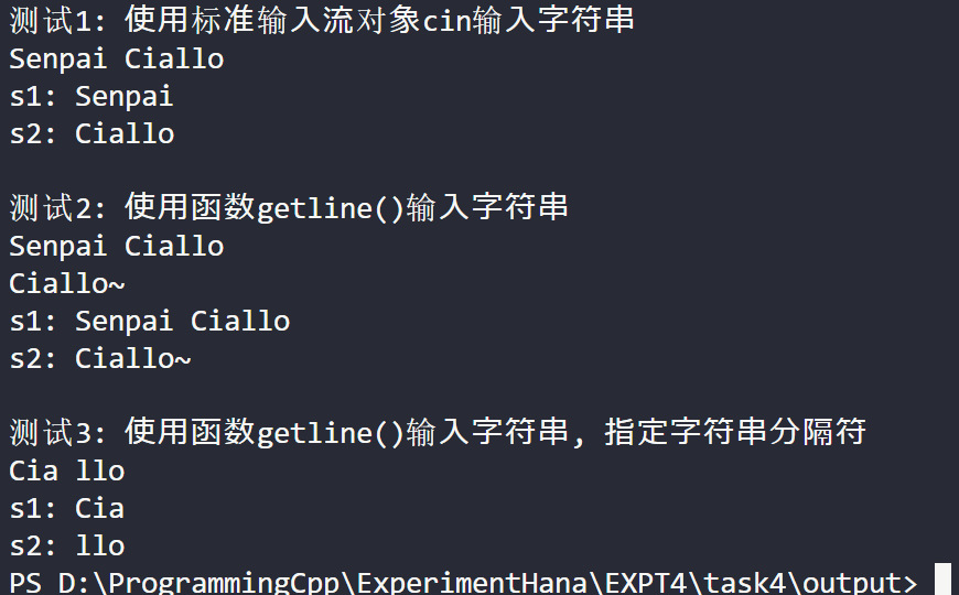 1 #include <iostream>//字符串的读取(空白符、缓冲区问题) 2 #include <string> 3 #include <limits> 4 5 using namespace std; 6 7 void test1() { 8 string s1, s2; 9 cin >> s1 >> s2; // cin: 从输入流读取字符串, 碰到空白符(空格/回车/Tab)即结束 10 cout << "s1: " << s1 << endl; 11 cout << "s2: " << s2 << endl; 12 } 13 14 void test2() { 15 string s1, s2; 16 getline(cin, s1); // getline(): 从输入流中提取字符串,直到遇到换行符 17 getline(cin, s2); 18 cout << "s1: " << s1 << endl; 19 cout << "s2: " << s2 << endl; 20 } 21 22 void test3() { 23 string s1, s2; 24 getline(cin, s1, ' '); //从输入流中提取字符串,直到遇到指定分隔符 25 getline(cin, s2); 26 cout << "s1: " << s1 << endl; 27 cout << "s2: " << s2 << endl; 28 } 29 30 int main() { 31 cout << "测试1: 使用标准输入流对象cin输入字符串" << endl; 32 test1(); 33 cout << endl; 34 35 cin.ignore(numeric_limits<streamsize>::max(), '\n'); 36 37 cout << "测试2: 使用函数getline()输入字符串" << endl; 38 test2(); 39 cout << endl; 40 41 cout << "测试3: 使用函数getline()输入字符串, 指定字符串分隔符" << endl; 42 test3(); 43 }