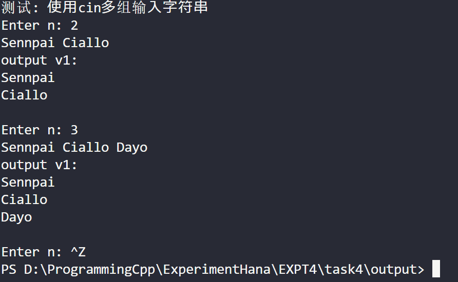1 #include <iostream> 2 #include <string> 3 #include <vector> 4 #include <limits> 5 6 using namespace std; 7 8 void output(const vector<string>& v) { 9 for (auto& s : v) 10 cout << s << endl; 11 } 12 13 void test() { 14 int n; 15 while (cout << "Enter n: ", cin >> n) { 16 vector<string> v1; 17 18 for (int i = 0; i < n; ++i) { 19 string s; 20 cin >> s; 21 v1.push_back(s); 22 } 23 24 cout << "output v1: " << endl; 25 output(v1); 26 cout << endl; 27 } 28 } 29 30 int main() { 31 cout << "测试: 使用cin多组输入字符串" << endl; 32 test(); 33 }