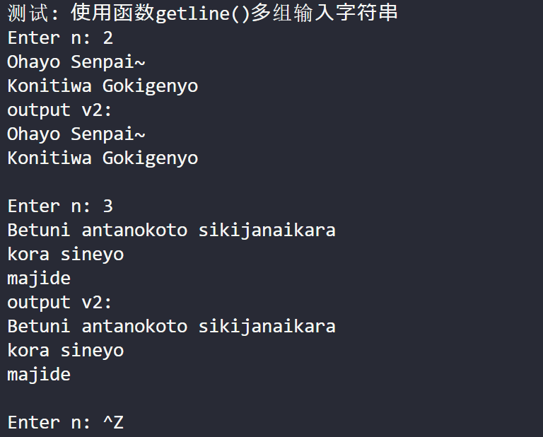 1 #include <iostream> 2 #include <string> 3 #include <vector> 4 #include <limits> 5 6 using namespace std; 7 8 void output(const vector<string>& v) { 9 for (auto& s : v) 10 cout << s << endl; 11 } 12 13 void test() { 14 int n; 15 16 while (cout << "Enter n: ", cin >> n) { 17 cin.ignore(numeric_limits<streamsize>::max(), '\n'); 18 19 vector<string> v2; 20 21 for (int i = 0; i < n; ++i) { 22 string s; 23 getline(cin, s); 24 v2.push_back(s); 25 } 26 cout << "output v2: " << endl; 27 output(v2); 28 cout << endl; 29 } 30 } 31 32 int main() { 33 cout << "测试: 使用函数getline()多组输入字符串" << endl; 34 test(); 35 }