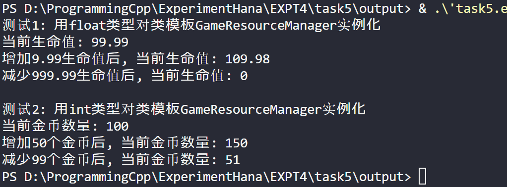 1 #include "grm.hpp" 2 #include <iostream> 3 4 using std::cout; 5 using std::endl; 6 7 void test1() { 8 GameResourceManager<float> HP_manager(99.99); 9 cout << "当前生命值: " << HP_manager.get() << endl; 10 HP_manager.update(9.99); 11 cout << "增加9.99生命值后, 当前生命值: " << HP_manager.get() << endl; 12 HP_manager.update(-999.99); 13 cout << "减少999.99生命值后, 当前生命值: " << HP_manager.get() << endl; 14 } 15 16 void test2() { 17 GameResourceManager<int> Gold_manager(100); 18 cout << "当前金币数量: " << Gold_manager.get() << endl; 19 Gold_manager.update(50); 20 cout << "增加50个金币后, 当前金币数量: " << Gold_manager.get() << endl; 21 Gold_manager.update(-99); 22 cout << "减少99个金币后, 当前金币数量: " << Gold_manager.get() << endl; 23 } 24 25 26 int main() { 27 cout << "测试1: 用float类型对类模板GameResourceManager实例化" << endl; 28 test1(); 29 cout << endl; 30 31 cout << "测试2: 用int类型对类模板GameResourceManager实例化" << endl; 32 test2(); 33 }