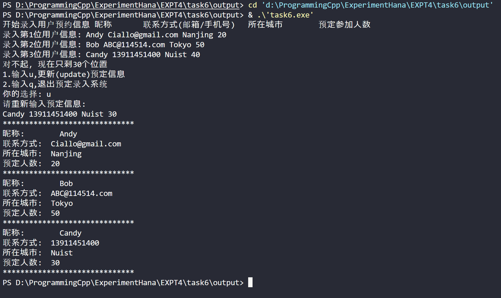 1 #include "info.hpp" 2 #include <iostream> 3 #include <vector> 4 5 using namespace std; 6 7 const int capacity = 100; 8 9 void print(vector<info> audience_lst) { 10 cout << string(30, '*') << endl; 11 for (const auto& i : audience_lst) 12 i.display(); 13 } 14 15 void menu() { 16 cout << "开始录入用户预约信息 "; 17 cout << "昵称" << "\t联系方式(邮箱/手机号)" << "\t所在城市" << "\t预定参加人数" << endl; 18 } 19 20 void input(vector<info>& audience_lst) { 21 string temp_name, temp_contact, temp_city; 22 int temp_n; 23 24 while (info::total_now < capacity) { 25 cout << "录入第" << audience_lst.size() + 1 << "位用户信息: "; 26 cin >> temp_name >> temp_contact >> temp_city >> temp_n; 27 28 if ((info::total_now + temp_n) > capacity) { 29 30 cout << "对不起,现在只剩" << capacity - info::total_now << "个位置" << endl; 31 cout << "1.输入u,更新(update)预定信息" << endl; 32 cout << "2.输入q,退出预定录入系统" << endl; 33 34 cout << "你的选择: "; 35 string choice; cin >> choice; 36 if (choice == "q") 37 break; 38 else { 39 cout << "请重新输入预定信息: " << endl; 40 cin >> temp_name >> temp_contact >> temp_city >> temp_n; 41 while ((info::total_now + temp_n) > capacity) { 42 cout << "重新输入的信息依旧无法录入,请再次录入: " << endl; 43 cin >> temp_name >> temp_contact >> temp_city >> temp_n; 44 } 45 audience_lst.push_back(info(temp_name, temp_contact, temp_city, temp_n)); 46 } 47 48 } 49 else { 50 audience_lst.push_back(info(temp_name, temp_contact, temp_city, temp_n)); 51 } 52 } 53 } 54 55 int main() { 56 vector<info> audience_lst; 57 58 menu(); 59 input(audience_lst); 60 print(audience_lst); 61 62 return 0; 63 }