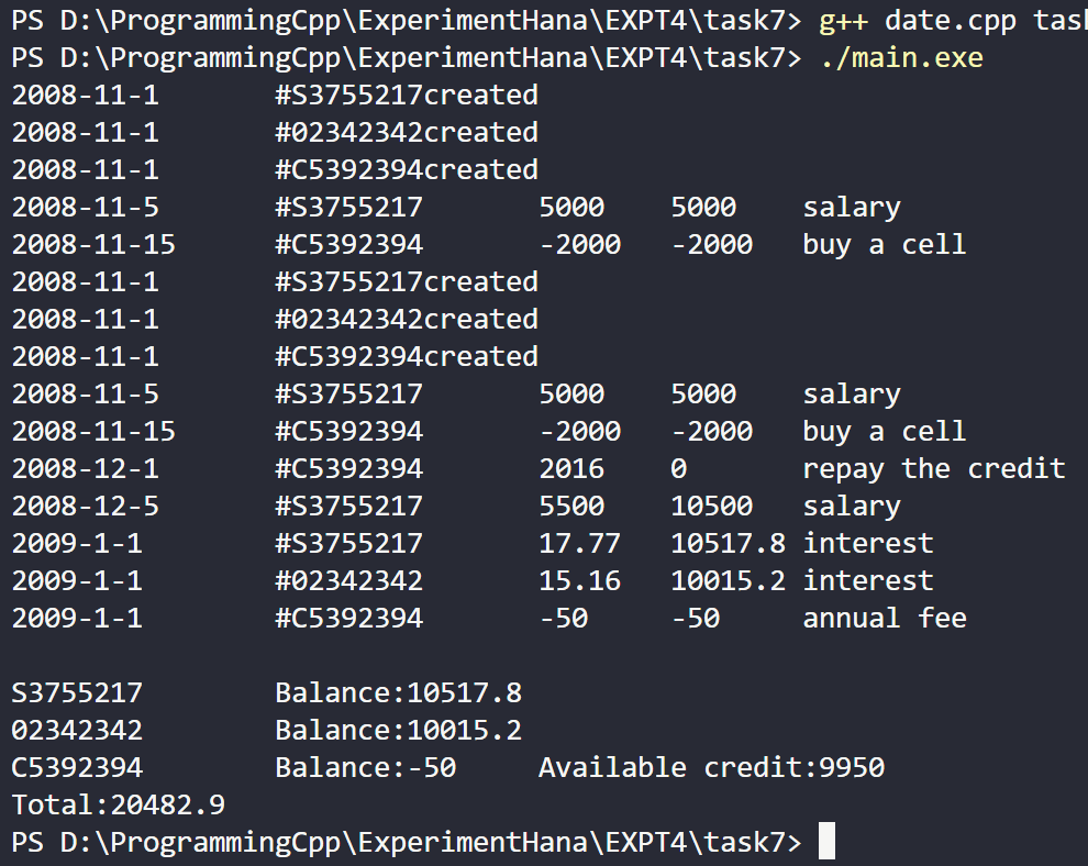 1 #include"account.h" 2 #include<cmath> 3 #include<iostream> 4 using namespace std; 5 double Account::total = 0; 6 7 Account::Account(const Date& date, const string& id) :id{ id }, balance{ 0 } { 8 date.show(); cout << "\t#" << id << "created" << endl; 9 } 10 11 12 void Account::record(const Date& date, double amount, const string& desc) { 13 amount = floor(amount * 100 + 0.5) / 100; 14 balance += amount; 15 total += amount; 16 date.show(); 17 cout << "\t#" << id << "\t" << amount << "\t" << balance << "\t" << desc << endl; 18 } 19 20 void Account::show()const { cout << id << "\tBalance:" << balance; } 21 void Account::error(const string& msg)const { 22 cout << "Error(#" << id << "):" << msg << endl; 23 } 24 25 SavingsAccount::SavingsAccount(const Date& date, const string& id, double rate) :Account(date, id), rate(rate), acc(date, 0) {} 26 27 void SavingsAccount::deposit(const Date& date, double amount, const string& desc) { 28 record(date, amount, desc); 29 acc.change(date, getBalance()); 30 } 31 32 void SavingsAccount::withdraw(const Date& date, double amount, const string& desc) { 33 if (amount > getBalance()) { 34 error("not enough money"); 35 } 36 else { 37 record(date, -amount, desc); 38 acc.change(date, getBalance()); 39 } 40 } 41 42 void SavingsAccount::settle(const Date& date) { 43 double interest = acc.getSum(date) * rate / date.distance(Date(date.getYear() - 1, 1, 1)); 44 if (interest != 0)record(date, interest, "interest"); 45 acc.reset(date, getBalance()); 46 } 47 48 CreditAccount::CreditAccount(const Date& date, const string& id, double credit, double rate, double fee) :Account(date, id), credit(credit), rate(rate), fee(fee), acc(date, 0) {} 49 50 void CreditAccount::deposit(const Date& date, double amount, const string& desc) { 51 record(date, amount, desc); 52 acc.change(date, getDebt()); 53 } 54 55 void CreditAccount::withdraw(const Date& date, double amount, const string& desc) { 56 if (amount - getBalance() > credit) { 57 error("not enough credit"); 58 } 59 else { 60 record(date, -amount, desc); 61 acc.change(date, getDebt()); 62 } 63 } 64 65 void CreditAccount::settle(const Date& date) { 66 double interest = acc.getSum(date) * rate; 67 if (interest != 0)record(date, interest, "interest"); 68 if (date.getMonth() == 1) 69 record(date, -fee, "annual fee"); 70 acc.reset(date, getDebt()); 71 } 72 73 void CreditAccount::show()const { 74 Account::show(); 75 cout << "\tAvailable credit:" << getAvailableCredit(); 76 }