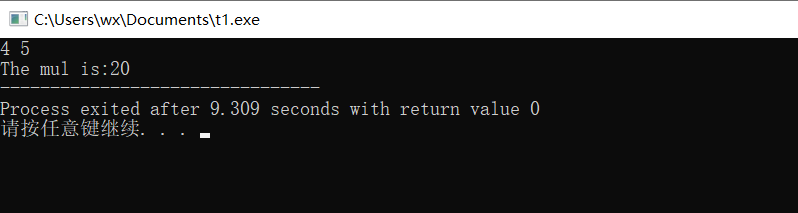 #include<stdio.h> int product(int,int); int main(void) { int x,y,s; scanf("%d %d",&x,&y); s = product(x,y); printf("The mul is:%d",s); return 0; } int product(int a,int b) { int mul; mul = a * b; return mul; }
