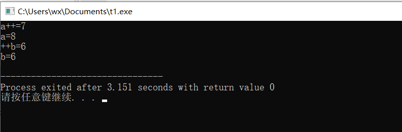 #include<stdio.h> int main() { int a=7,b=5; printf("a++=%d\n",a++); printf("a=%d\n",a); printf("++b=%d\n",++b); printf("b=%d\n",b); return 0; }