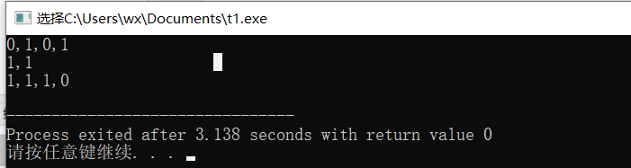 #include<stdio.h> int main() { int a=5,b=8,c=8; printf("%d,%d,%d,%d\n",a==b&&a==c,a!=b&&a!=c,a>=b&&a>=c,a<=b&&a<=c); printf("%d,%d\n",a<=b||a>=c,a==b||b==c); printf("%d,%d,%d,%d\n",!(a==b),!(a>=b),!(a>=c),!(a<=b)); return 0; }