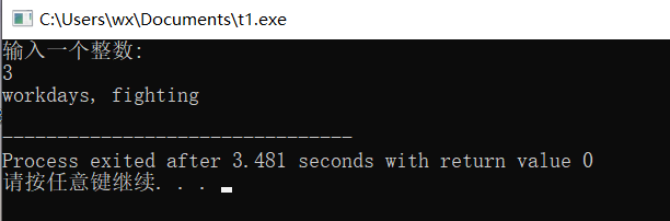 /* 程序功能: 要求用户从键盘输入1~7之间的整数 如果输入的是1~5, 提示用户是工作日,要努力工作; 如果输入的是6或7,提示用户是休息日,放松休息; 否则,提示用户输入不在合法范围 */ #include <stdio.h> int main() { int days; printf("输入一个整数: \n"); scanf("%d",&days); // 补足×××处的表达式,使得满足程序功能描述 if(days>=1&&days<=5) // days在1到5之间 printf("workdays, fighting\n"); else if(days=6||7) // days是6或7 printf("weekend, relax~\n"); else printf("Ooops, not in 1~7\n"); return 0