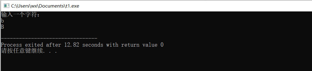 //功能: //从键盘上输入单个字符 //如果是小写字母。则转换成大写后输出 //否则,什么也不做,原样输出 #include<stdio.h> int main() { char ch; printf("输入一个字符:\n"); scanf("%c",&ch); //根据程序功能描述,补足程序 if(ch>=97&&ch<=122)//如果ch是小写字母,补足判定ch是小写字母的表达式 ch=ch-32;//补足把ch中的小字母转换成大写字母的表达式语句 //说明:语句就是在表达式末尾加分号; printf("%c\n",ch) ; return 0; }