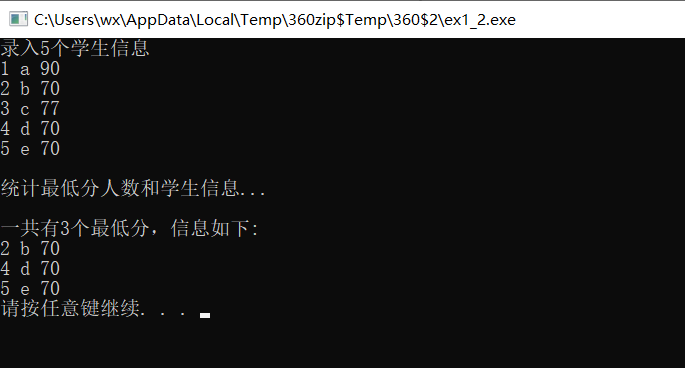 #include <stdio.h> #include <stdlib.h> const int N=5; // 定义结构体类型struct student,并定义STU为其别名 typedef struct student { long no; char name[20]; int score; }STU; // 函数声明 void input(STU s[], int n); int findMinlist(STU s[], STU t[], int n); void output(STU s[], int n); int main() { STU stu[N], minlist[N]; int count; printf("录入%d个学生信息\n", N); input(stu, N); printf("\n统计最低分人数和学生信息...\n"); count = findMinlist(stu, minlist, N); printf("\n一共有%d个最低分,信息如下:\n", count); output(minlist, count); system("pause"); return 0; } // 输入n个学生信息,存放在结构体数组s中 void input(STU s[], int n) { int i; for(i=0; i<n; i++) scanf("%ld %s %d", &s[i].no, s[i].name, &s[i].score); } // 输出结构体s中n个元素信息 void output(STU s[], int n) { int i; for(i=0; i<n; i++) printf("%ld %s %d\n", s[i].no, s[i].name, s[i].score); } // 在结构体数组s中,查找最低分学生的记录,将其存入结构体数组s中 // 形参n是结构体数组s中元素个数 // 函数返回最低分的学生人数 int findMinlist(STU s[], STU t[], int n) { // 补足函数实现 // ××× int i,j; STU temp; for(i=0;i<n-1;i++) for(j=i;j<n-i-i;j++) { if(s[j].score>=s[j+1].score) temp=s[j]; s[j]=s[j+1]; s[j+1]=temp; } int k=0; for(i=0;i<n;i++) { if(s[i].score==s[0].score) t[k++]=s[i]; } return k; }