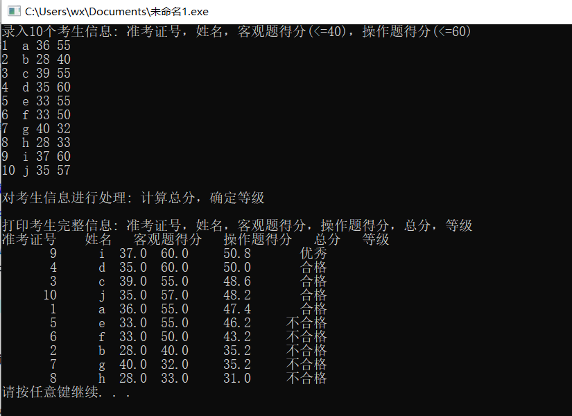#include <stdio.h> #include <stdlib.h> #include <string.h> const int N = 10; // 定义结构体类型struct student,并定义其别名为STU typedef struct student { long int id; char name[20]; float objective; /*客观题得分*/ float subjective; /*操作题得分*/ float sum; char level[10]; }STU; // 函数声明 void input(STU s[], int n); void output(STU s[], int n); void process(STU s[], int n); int main() { STU stu[N]; printf("录入%d个考生信息: 准考证号,姓名,客观题得分(<=40),操作题得分(<=60)\n", N); input(stu, N); printf("\n对考生信息进行处理: 计算总分,确定等级\n"); process(stu, N); printf("\n打印考生完整信息: 准考证号,姓名,客观题得分,操作题得分,总分,等级\n"); output(stu, N); system("pause"); return 0; } // 录入考生信息:准考证号,姓名,客观题得分,操作题得分 void input(STU s[], int n) { // 补足代码 // ××× int i; for(i=0;i<n;i++) scanf("%d %s %f %f",&s[i].id,s[i].name,&s[i].objective,&s[i].subjective); } //输出考生完整信息: 准考证号,姓名,客观题得分,操作题得分,总分,等级 void output(STU s[], int n) { // 补足代码 // ××× int i; printf("准考证号 姓名 客观题得分 操作题得分 总分 等级\n"); for(i=0;i<n;i++) printf("%8d %6s %5.1f %5.1f %8.1f %10s\n",s[i].id,s[i].name,s[i].objective,s[i].subjective,s[i].sum,s[i].level) ; } // 对考生信息进行处理:计算总分,排序,确定等级 void process(STU s[], int n) { // 补足代码 // ××× int i,j; STU temp; for(i=0;i<n;i++) { s[i].sum=s[i].objective*0.4+s[i].subjective*0.6; } for(i=0;i<n;i++) for(j=0;j<n;j++) if(s[j].sum<s[j+1].sum) { temp = s[j]; s[j] = s[j+1]; s[j+1] = temp; } for(i=0;i<n;i++) { if(i==0) strcpy(s[i].level,"优秀"); else if(i>=1&&i<=4) strcpy(s[i].level,"合格"); else strcpy(s[i].level,"不合格");} }
