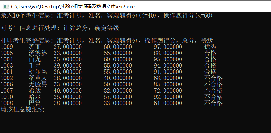 #include <stdio.h> #include <stdlib.h> #include <string.h> const int N = 10; // 定义结构体类型struct student,并定义其别名为STU typedef struct student { long int id; char name[20]; float objective; /*客观题得分*/ float subjective; /*操作题得分*/ float sum; char level[10]; }STU; // 函数声明 void input(STU s[], int n); void output(STU s[], int n); void process(STU s[], int n); int main() { STU stu[N]; printf("录入%d个考生信息: 准考证号,姓名,客观题得分(<=40),操作题得分(<=60)\n", N); input(stu, N); printf("\n对考生信息进行处理: 计算总分,确定等级\n"); process(stu, N); printf("\n打印考生完整信息: 准考证号,姓名,客观题得分,操作题得分,总分,等级\n"); output(stu, N); system("pause"); return 0; } // 从文本文件examinee.txt读入考生信息:准考证号,姓名,客观题得分,操作题得分 void input(STU s[], int n) { // 补足代码 // ××× int i; FILE *fp; fp=fopen("examinee.txt","r"); if(!fp) { printf("fail to open\n"); exit(0); } for(i=0;i<n;i++) fscanf(fp,"%ld %s %f %f\n",&s[i].id,s[i].name,&s[i].objective,&s[i].subjective); fclose(fp); } // 输出考生完整信息: 准考证号,姓名,客观题得分,操作题得分,总分,等级 // 不仅输出到屏幕上,还写到文本文件result.txt中 void output(STU s[], int n) { // 补足代码 // ××× int i; FILE *fout; fout=fopen("result.txt","w"); if(!fout) { printf("fail to open\n"); exit(0); } for(i=0;i<n;i++) { fprintf(fout,"%ld\t %s\t %lf\t %lf\t %lf\t %s\t\n",s[i].id,s[i].name,s[i].objective,s[i].subjective,s[i].sum,s[i].level); printf("%ld\t %s\t %lf\t %lf\t %lf\t %s\t\n",s[i].id,s[i].name,s[i].objective,s[i].subjective,s[i].sum,s[i].level); } fclose(fout); } // 对考生信息进行处理:计算总分,排序,确定等级 void process(STU s[], int n) { // 补足代码 // ××× int i,j; STU temp; for(i=0;i<n;i++) s[i].sum=s[i].objective+s[i].subjective; for(i=0;i<n;i++) for(j=0;j<n-i-1;j++) { if(s[i].sum<s[j+1].sum) { temp=s[j]; s[j]=s[j+1]; s[j+1]=temp; } } for(i=0;i<n;i++) { if((i+1)<=n*0.1) strcpy(s[i].level,"优秀"); else if((i+1)<=n*0.5&&(i+1)>n*0.1) strcpy(s[i].level,"合格"); else strcpy(s[i].level,"不合格"); } }