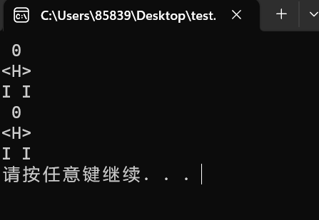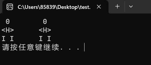 1 #include<stdio.h> 2 #include<stdlib.h> 3 int main(){ 4 printf(" 0 \n"); 5 printf("<H>\n"); 6 printf("I I\n"); 7 printf(" 0 \n"); 8 printf("<H>\n"); 9 printf("I I\n"); 10 system("pause"); 11 return 0; 12 }