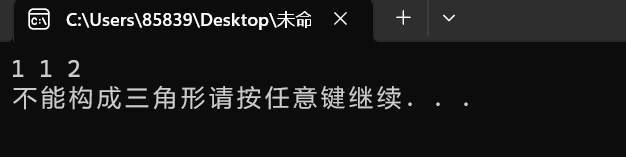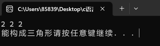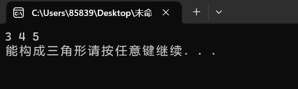 1 #include<stdio.h> 2 #include<stdlib.h> 3 int main(){ 4 float a, b, c; 5 scanf("%f%f%f",&a,&b,&c); 6 if(a+b>c&&a+c>b&&b+c>a){ 7 printf("能构成三角形"); 8 } 9 else{ 10 printf("不能构成三角形"); 11 } 12 system("pause"); 13 return 0; 14 }