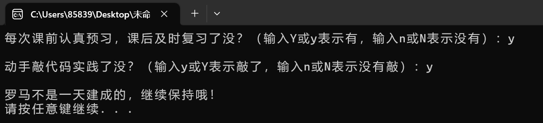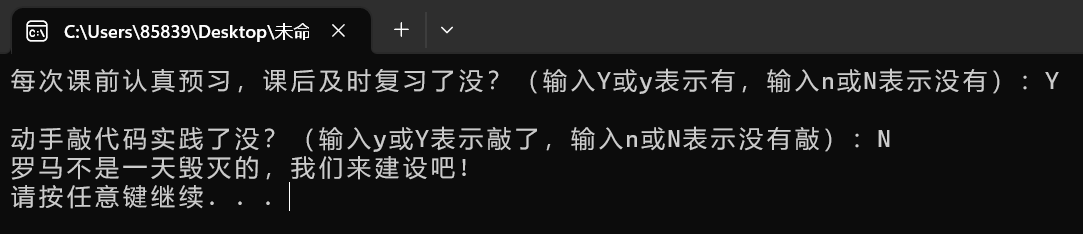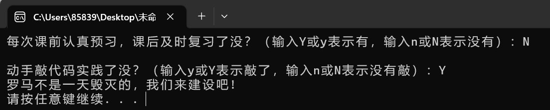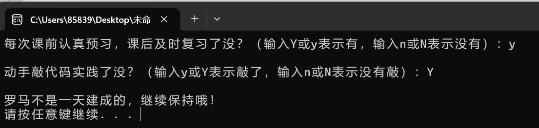 1 #include<stdio.h> 2 #include<stdlib.h> 3 int main(){ 4 char ans1,ans2; 5 printf("每次课前认真预习,课后及时复习了没?(输入Y或y表示有,输入n或N表示没有):"); 6 ans1 = getchar();//由于回车键也是一种字符,此行代码为了取到正确输入结果,防止回车键干扰运行结果 7 getchar(); 8 printf("\n动手敲代码实践了没?(输入y或Y表示敲了,输入n或N表示没有敲):"); 9 ans2 = getchar(); 10 if((ans1 == 'y'||ans1 =='Y')&&(ans2 == 'y'||ans2 == 'Y')) { 11 printf("\n罗马不是一天建成的,继续保持哦!\n"); 12 } 13 else{ 14 printf("罗马不是一天毁灭的,我们来建设吧!\n"); 15 } 16 system("pause"); 17 return 0; 18 }
