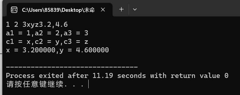 1 #include<stdio.h> 2 int main(){ 3 double x, y; 4 char c1, c2, c3; 5 int a1, a2, a3; 6 scanf("%d%d%d",&a1,&a2,&a3);/*少了&字符,不能获取到输入的数字*/ 7 printf("a1 = %d,a2 = %d,a3 = %d\n",a1,a2,a3); 8 scanf("%c%c%c",&c1,&c2,&c3); 9 printf("c1 = %c,c2 = %c,c3 = %c\n",c1,c2,c3); 10 scanf("%lf,%lf",&x,&y);/*f是单精度浮点型,而lf才是双精度浮点型与上文double对应*/ 11 printf("x = %lf,y = %lf\n",x,y); 12 return 0; 13 14 }