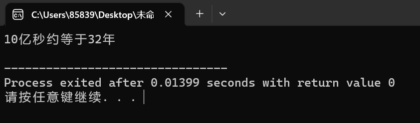 1 #include<stdio.h> 2 int main(){ 3 int year; 4 double c = 10.0*10*10*10*10*10*10*10*10/60/60/24/365; 5 int b = c; 6 double a = c-b; 7 if(a>=0&&a<0.5){ 8 year = b; 9 } 10 else { 11 year = b+1; 12 } 13 printf("10亿秒约等于%d年\n",year); 14 return 0; 15 }