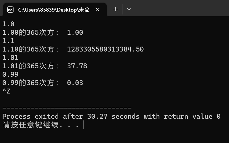 #include<stdio.h> #include<math.h> int main(){ double x,ans; while(scanf("%lf",&x)!=EOF){ ans = pow(x,365); printf("%.2f的365次方: %.2f\n",x,ans); } return 0; }