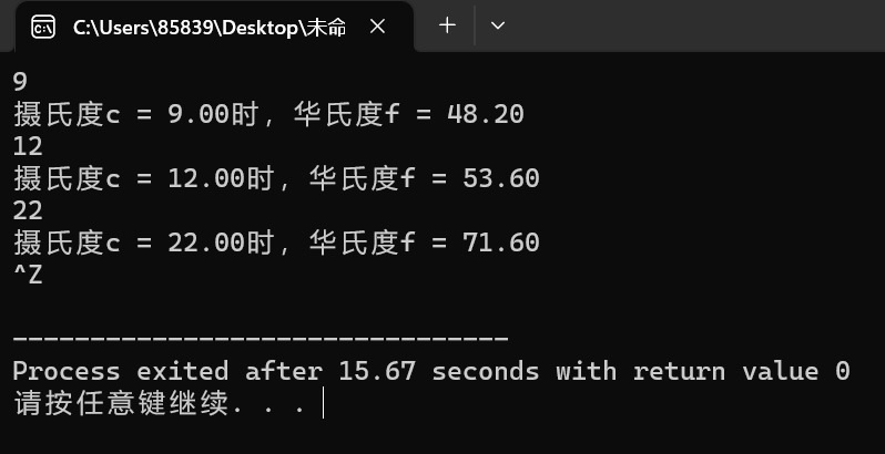 1 #include<stdio.h> 2 int main(){ 3 double c,f; 4 while(scanf("%lf",&c)!=EOF){ 5 f = c*9.0/5+32; 6 printf("摄氏度c = %.2lf时,华氏度f = %.2lf\n",c,f); 7 } 8 return 0; 9 }