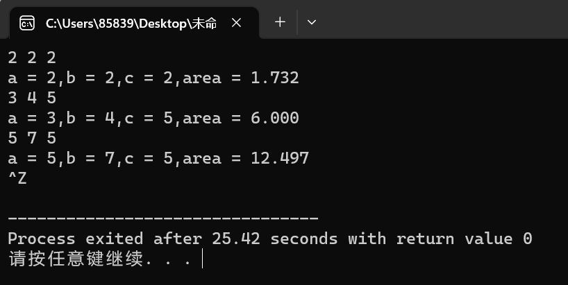 1 #include<stdio.h> 2 #include<math.h> 3 int main(){ 4 int a,b,c; 5 double s,area; 6 while(scanf("%d %d %d",&a,&b,&c) != EOF){ 7 s = (a+b+c)/2.0; 8 area = sqrt(s*(s-a)*(s-b)*(s-c)); 9 printf("a = %d,b = %d,c = %d,area = %.3lf\n",a,b,c,area); 10 } 11 }