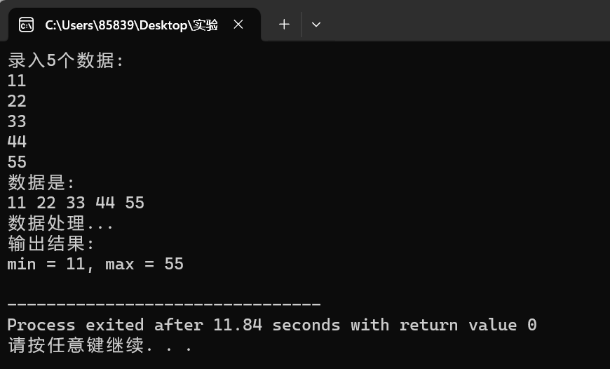 1 #include <stdio.h> 2 #define N 5 3 4 void input(int x[], int n); 5 void output(int x[], int n); 6 void find_min_max(int x[], int n, int *pmin, int *pmax); 7 8 int main() { 9 int a[N]; 10 int min, max; 11 12 printf("录入%d个数据:\n", N); 13 input(a, N); 14 15 printf("数据是: \n"); 16 output(a, N); 17 18 printf("数据处理...\n"); 19 find_min_max(a, N, &min, &max); 20 21 printf("输出结果:\n"); 22 printf("min = %d, max = %d\n", min, max); 23 24 return 0; 25 } 26 27 void input(int x[], int n) { 28 int i; 29 30 for(i = 0; i < n; ++i) 31 scanf("%d", &x[i]); 32 } 33 34 void output(int x[], int n) { 35 int i; 36 37 for(i = 0; i < n; ++i) 38 printf("%d ", x[i]); 39 printf("\n"); 40 } 41 42 void find_min_max(int x[], int n, int *pmin, int *pmax) { 43 int i; 44 45 *pmin = *pmax = x[0]; 46 47 for(i = 1; i < n; ++i) 48 if(x[i] < *pmin) 49 *pmin = x[i]; 50 else if(x[i] > *pmax) 51 *pmax = x[i]; 52 }